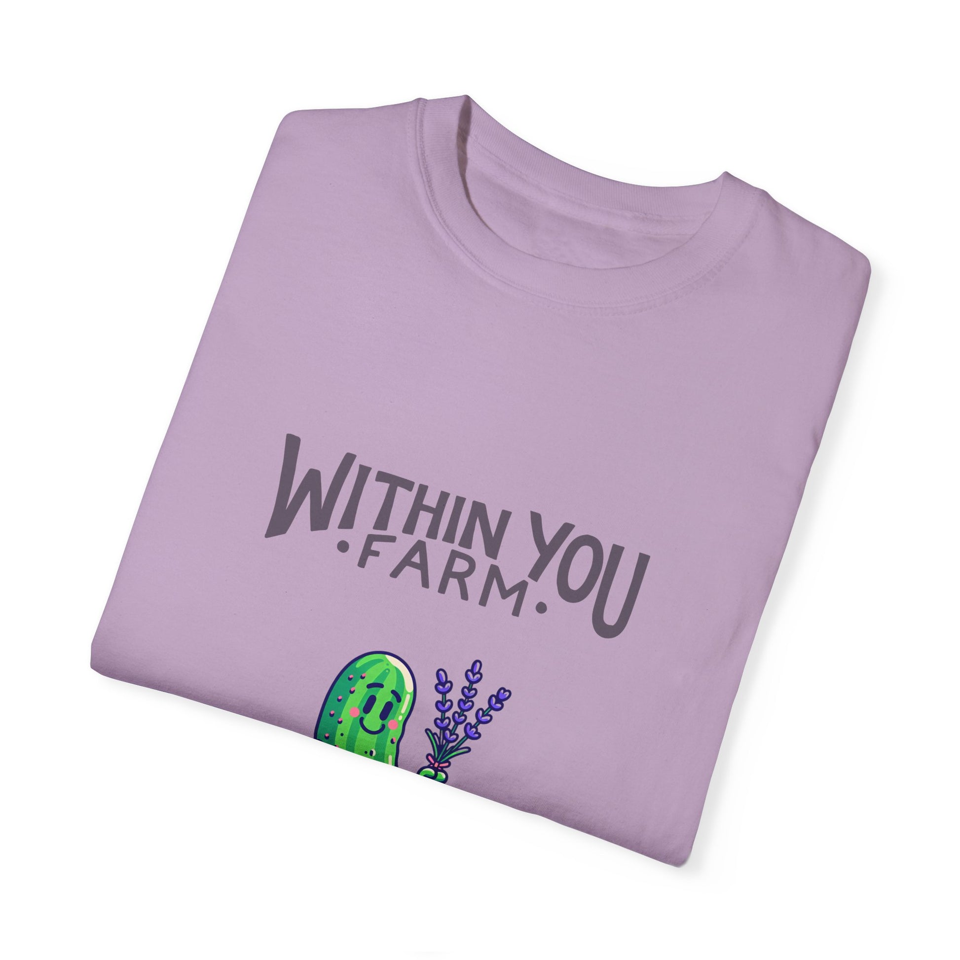 A Comfort Colors T-Shirt to honor our quirky lavender pickles - a Within You Farm original. The soft-washed, garment-dyed fabric brings extra coziness to your wardrobe while the relaxed fit makes it an excellent daily choice. The double-needle stitching throughout the tee makes it highly durable while the lack of side-seams helps the shirt retain its tubular shape.