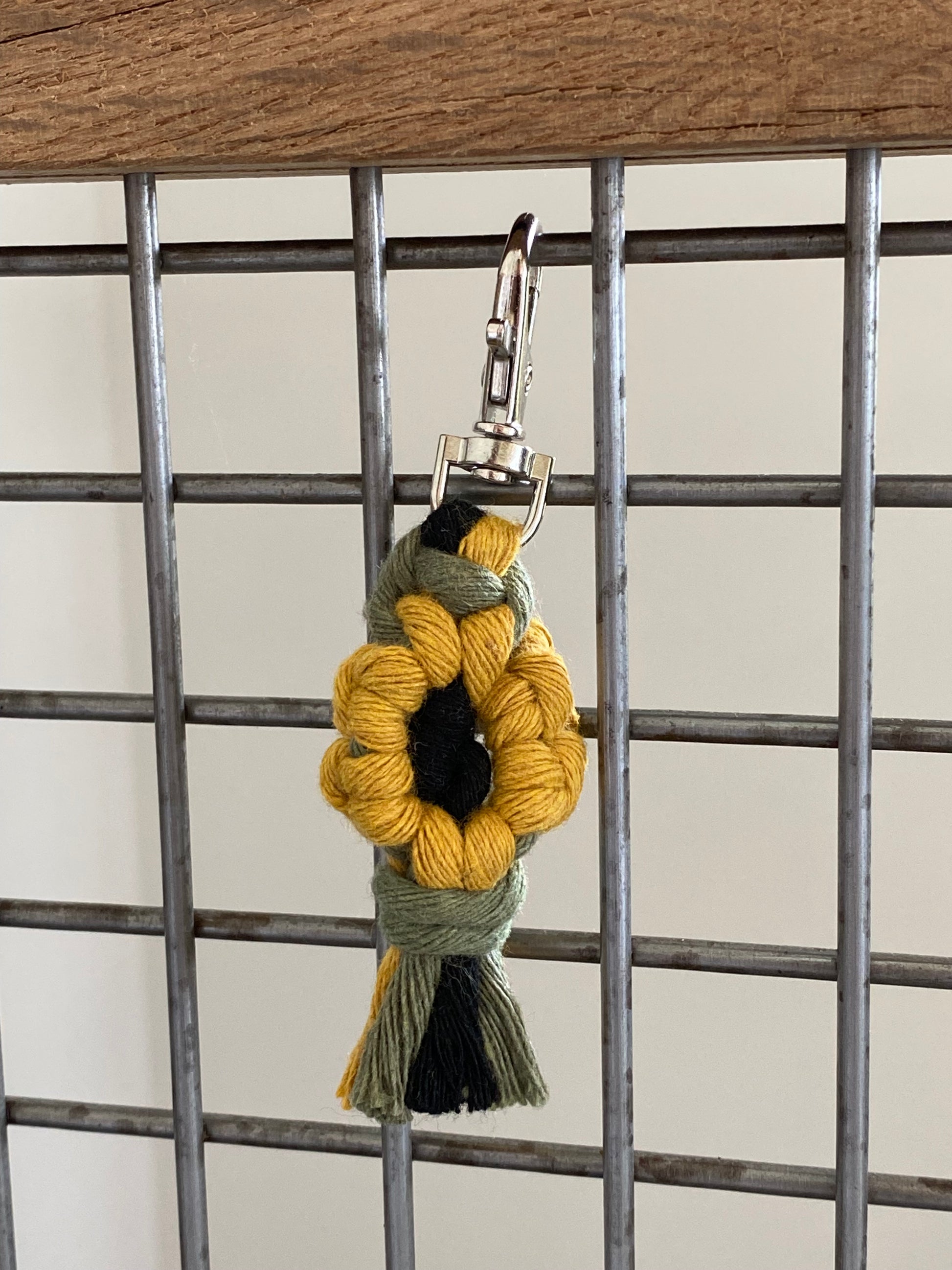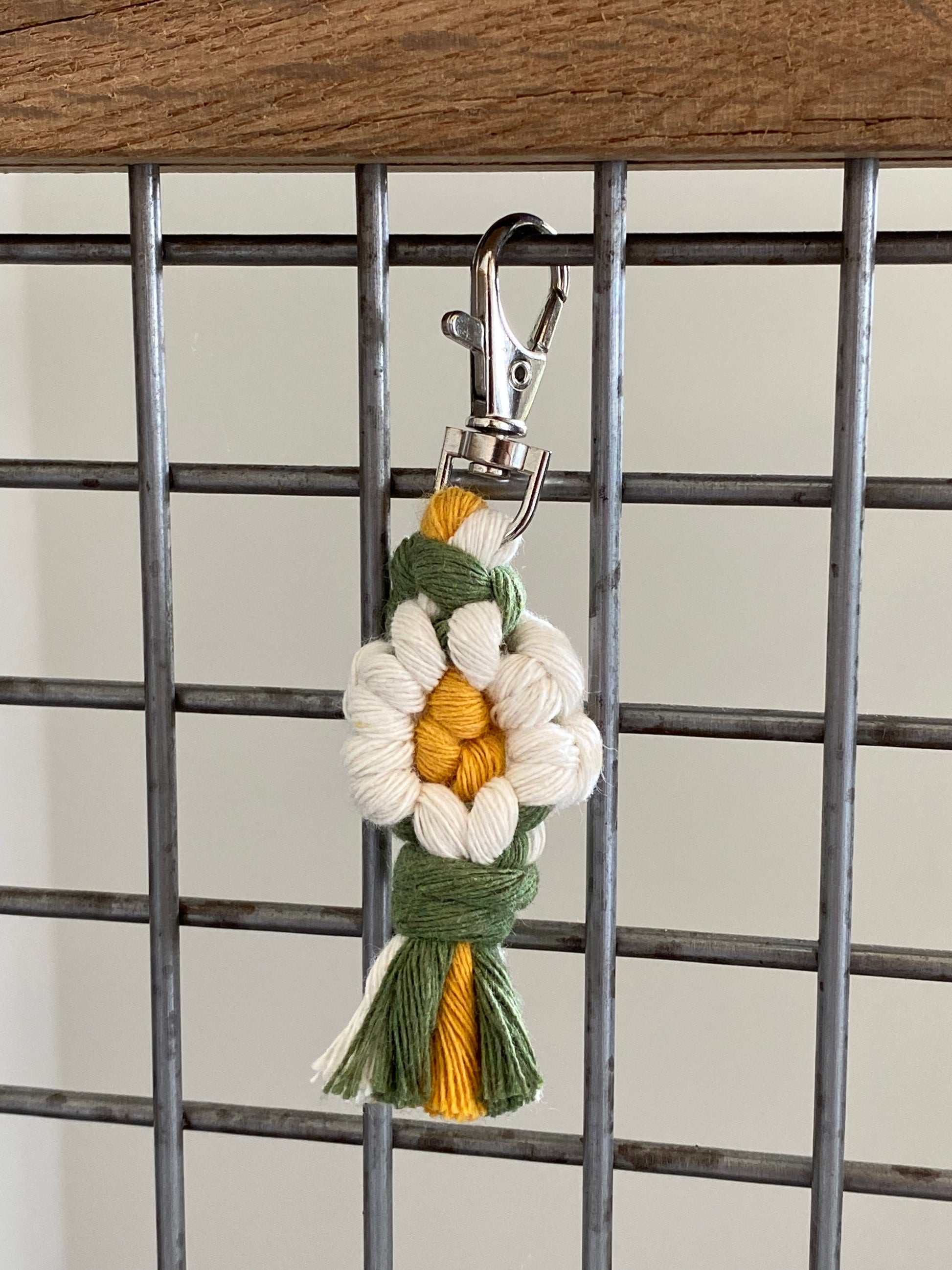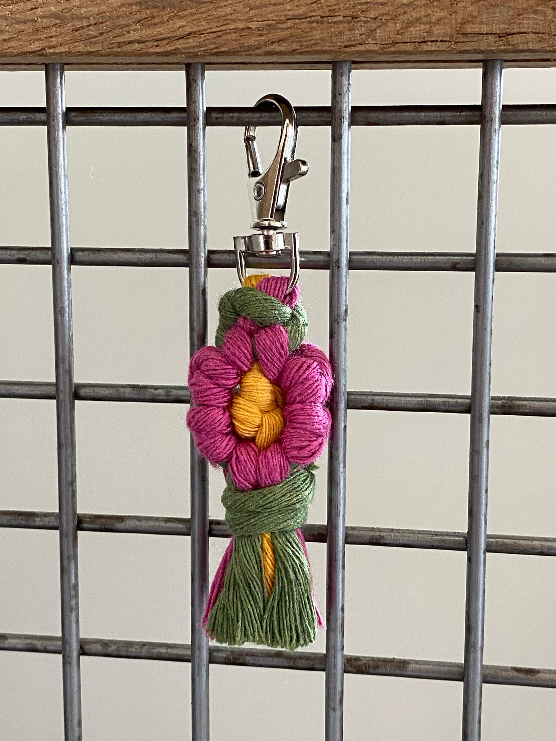 Add a touch of boho style to your keys with a Macrame Flower Keychain made by Why Knot. Hand-crafted in Pennsylvania with a sustainable recycled cotton cord, each keychain is 4 inches long and 1 inch wide.